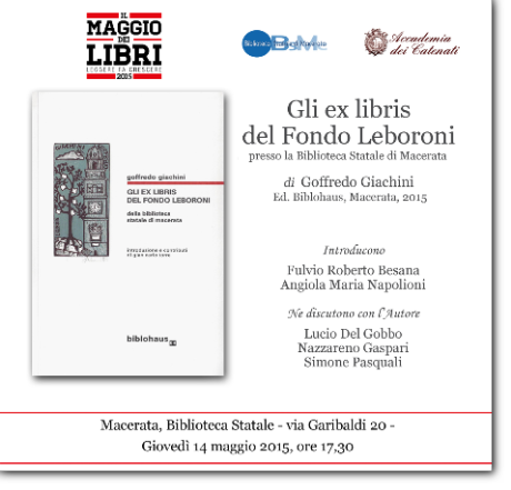 Giovedì 14 maggio si è svolta presso la Biblioteca Statale di Macerata la presentazione del libro di Goffredo Giachini “Gli Ex Libris del Fondo Leboroni della Biblioteca Statale di Macerata”, edito da Biblohaus. Si tratta della seconda iniziativa promossa dalla Biblioteca Statale e dall’Accademia dei Catenati nell’ambito della quinta edizione del “Maggio dei libri”. Insieme all’Autore hanno partecipato Lucio Del Gobbo, Nazzareno Gaspari e Simone Pasquali. Hanno introdotto Fulvio Roberto Besana e Angiola Maria Napolioni.
