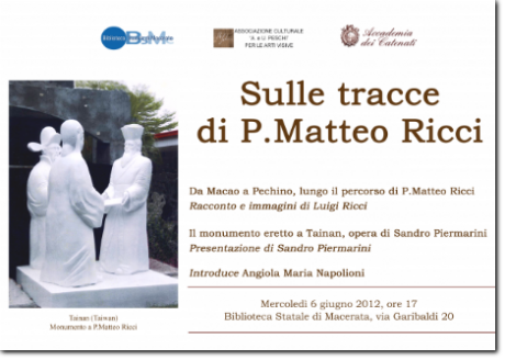 Mercoledì 6 giugno si è svolto presso la Biblioteca Statale di Macerata l'incontro su P.Matteo Ricci, nel corso del quale Luigi Ricci ha illustrato il suo viaggio da Macao a Pechino, lungo il percorso del missionario maceratese della cui famiglia è discendente, e Sandro Piermarini ha presentato il monumento a P.Matteo Ricci da lui realizzato tra gennaio e marzo del 2012 a Tainan, nella regione sud-occidentale di Taiwan. Ha introdotto e coordinato l'incontro Angiola Maria Napolioni.