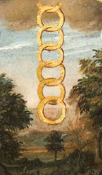 “Il corpo dell’Impresa sia una Cathena d’oro distesa di cielo in terra (.....). Il Cielo dimostra che in lui è il principio et il fin nostro, la Cathena mostra i gradi di ascendere et discendere dal Cielo et in Cielo: l’oro dimostra, che, siccome dal Cielo non discende in terra altro che bene, così ancora per altra strada che di beni di virtù e di fatiche nobili non si ascende al Cielo. La terra poi significherà noi Mortali. Il corpo dell’Impresa, cioè la Cathena d’oro è da Homero; il restante è di Platone, et indi si può conoscere l’Impresa essere di grande autorità e maggior dottrina”. (2)