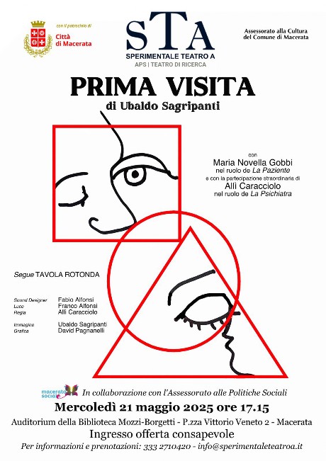 PRIMA VISITA è una drammaturgia scritta da Ubaldo Sagripanti, che sarà rappresentata mercoledì 21 maggio 2025, alle ore 17.15, dallo Sperimentale Teatro A (STA) per la regia di Allì Caracciolo, nell’Auditorium della Biblioteca Comunale Mozzi-Borgetti, con il Patrocinio del Comune di Macerata.