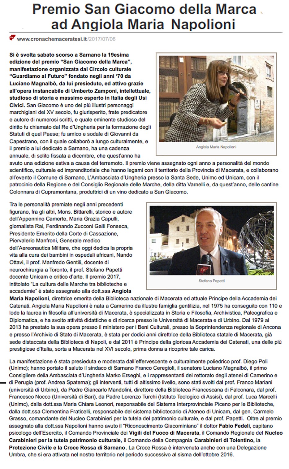 Il Premio "San Giacomo della Marca" 2017 è stato assegnato al Principe della nostra Accademia Angiola Maria Napolioni.